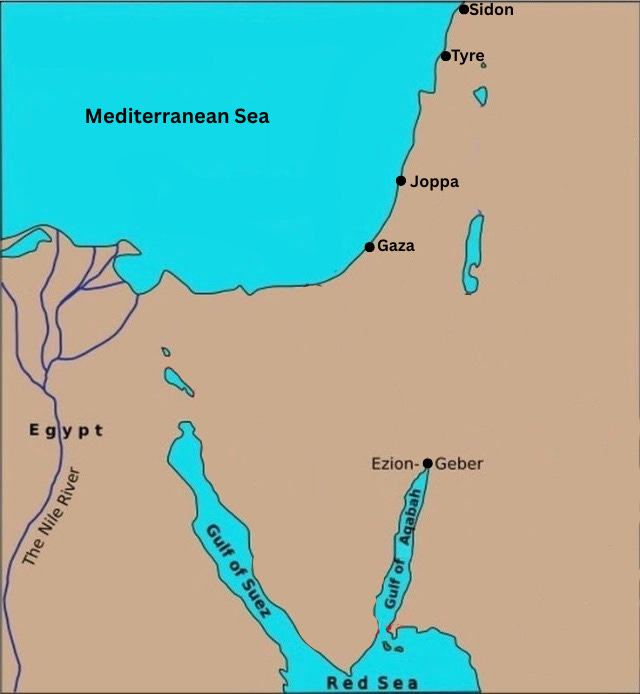 In return, Solomon granted Hiram access to the Gulf of Aqaba port of Ezion-geber for voyages to India.1 Tyre established a merchant fleet there, known as the Ships of Tarshish2 which sailed to Ophir, probably the western Indian Ocean, including the Red Sea and Persian Gulf, later called the Erythraean Sea by the Romans. These voyages returned with gold, silver, ivory, panther skins, spices, gems, apes, peacocks, ebony, rice, cotton textiles, and cinnamon.