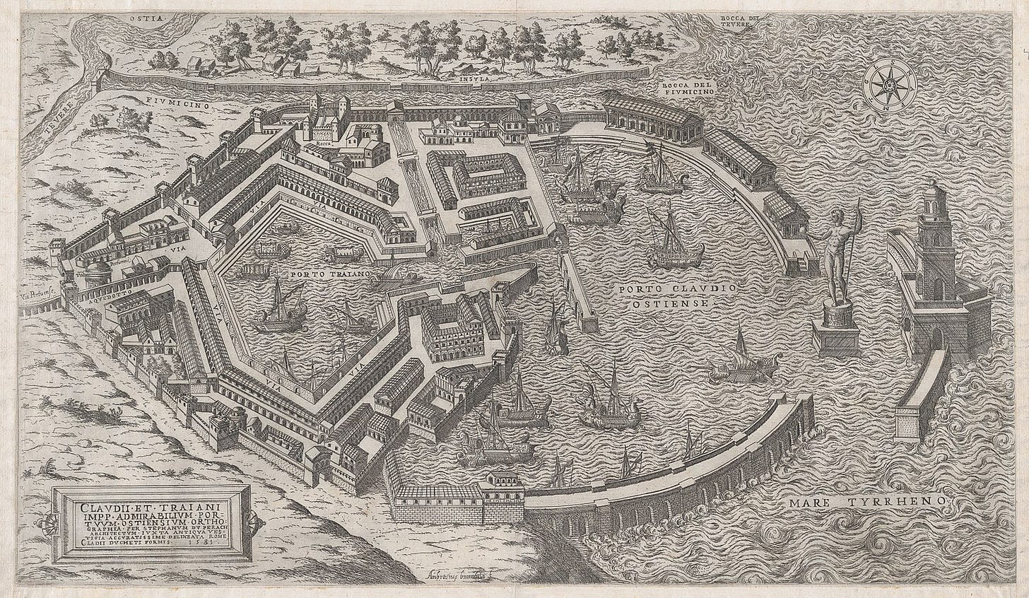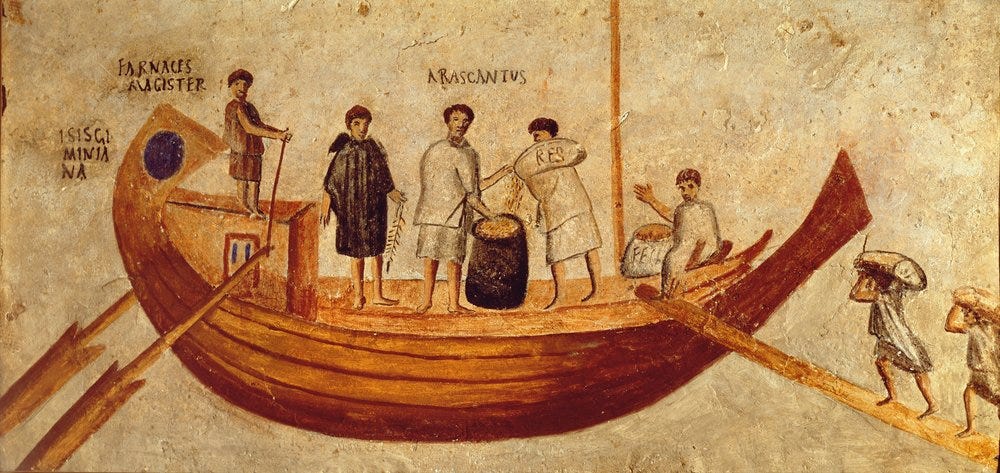 However, the majority of inter-Mediterranean trade involved food, particularly grain. Egypt supplied 135,000 tons annually, and Sicily contributed 270,000 tons. Egyptian grain was transported in massive ships, some carrying 1,200–1,300 tons, a capacity unmatched until the 19th century. Under Augustus’s successors, Egyptian grain imports tripled, becoming vital for feeding the empire, especially Rome, via the ports of Puteoli and Ostia, the latter serving as Rome’s economic hub and requiring careful oversight.